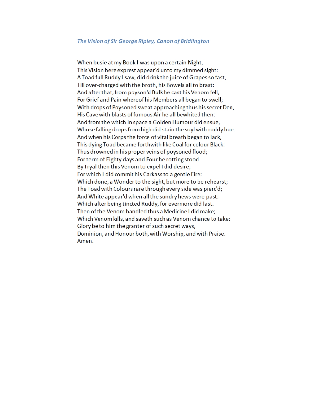 A mitologémák szintje * Népmesei szerepkörök * A „Kétéltűség” alkímiai értelmezése * A „Termékeny Üledék” * Az alkímiai szemlélet sajátossága: eltolódás az általános Béka-megjelenítésektől a specifikus „Varangy” irányába („Bufo Bufo” – „Frog” helyett „Toad”, „Grenouille” helyett „Crapaud” a különféle szövegekben…) * A Varangy az alkímiai operációk vonatkozásában * Az Atalanta Fugiens híres „Varangy-ábrázolása” (A kép és a hozzá tartozó aforizma értelmezése) * A Varangy figyelemre méltó manifesztációi H. Bosch triptichonjának Pokol-ábrázolásán (A Gyönyörök Kertje) * Sir George Ripley látomása „egy Vörös Varangyról” („a Toade full Rudde”) * Záró gondolatok